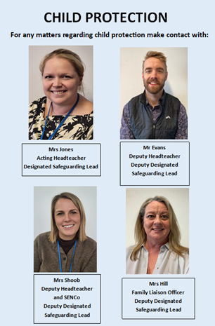 If you have any concerns regarding the welfare of a child, please contact Mrs Jones (Acting Headteacher) or Mr Evans (Deputy Headteacher), Mrs Shoob (Deputy Headteacher and SENCo) or Mrs Hill (Family Liaison Officer) via the school office on 01303 257280.